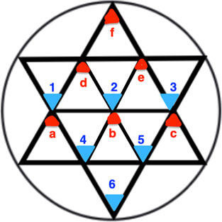 В этом треугольнике, мы обозначим все углы красным цветом, для того, чтобы ми не запутались, и мы их с вами назовем a, b, c, d, е, f. Это у нас энергия, и это у нас потенциал, жизненная сила. И это то, что пробуждает наши базовые истории и дает нам «Мета мандалу года»