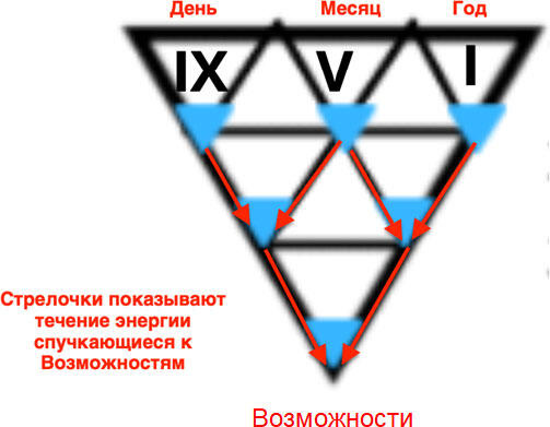 В верхнем треугольнике у нас с вами была записана базовая история: Наша дата рождения 2- IX (9). Далее в следующем треугольнике пишем 2- V (5). В следующем треугольнике ставим 2- I (1), сюда переношу свой год.