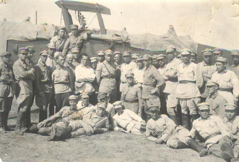 В эскадрильи им. Ильича. Папа верхний, облокотился на крыло самолета.
