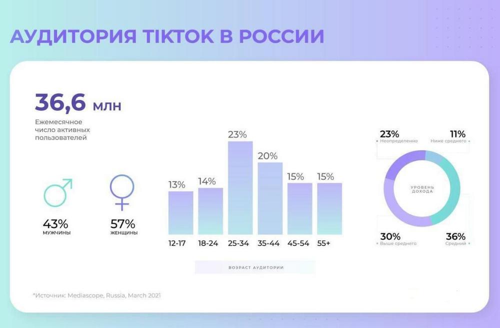 Ежемесячная аудитория соцсети коротких видео составляет 36,6 млн (данные на начало апреля 2021), что на 3 млн больше по сравнению с началом 2021 года. Причём в российском TikTok преобладает прекрасная половина всего в соцсети 57% женщин. А вот распределение по возрасту со временем практически не меняется: 43% пользователей TikTok от 25 до 44 лет то основа развлекательной соцсети.