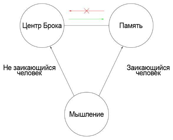 От центра Брока́ к памяти я нарисовал стрелку, означающую, что связь работает. А в обратную сторону перечеркнутую стрелку, так как нельзя через память, по которой пытается говорить заикающийся человек, подключить центр Брока́ и начать разговаривать осмысленными предложениями. Работает только в первом варианте: речь создаётся в мышлении и произносится через центр Брока́, который использует память. Заикающийся человек не туда обращается.