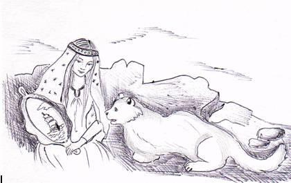 Самый маленький из осколков посоха не упал далеко. Он закатился в логово снежных барсов, которые жили так же высоко в горах, как и Снежные девы. Ты знаешь, кто такие снежные барсы? Это большие, пушистые дикие кошки, которые чувствуют себя среди холодных тёмных скал, камней, льда и белого снега так же хорошо, как и ты в своём тёплом доме. Их лохматые шубы покрыты красивыми чёрными пятнами, полукольцами и полосами. Осколок засверкал, оказавшись в тёмном логове, и его свет отразился в зеленоватых глазах большой барсихи и её маленьких детёнышей. В тот же миг они стали мыслить, как люди, говорить и понимать речь всех живых существ на земле. Один из детёнышей был очень смышлёным, непоседливым и любопытным. Знаешь, как его называла мама? Она называла его Золотые глаза, потому что глаза у него в самом деле были красивые, зеленоватые, с золотистым ободком вокруг зрачка. Сначала этот детёныш отличался от своих братьев и сестёр только тем, что его шкура была абсолютно белой. Но когда он стал подрастать, отличия начали усиливаться не по дням, а по часам. Всех его родственников вполне устраивала жизнь в кругу других барсов, друзей и знакомых, он же то и дело искал новых впечатлений и приключений. Очень скоро он открыл, что рядом в горах живут вечно юные волшебницы Снежные девы. Не раз стелящейся походкой он подкрадывался почти вплотную к их ледяным дворцам, прятался за какое-нибудь возвышение и наблюдал за их повседневной жизнью. Случалось ему следовать незаметно и за отдельными волшебницами во время их прогулок. Мать барсиха не одобряла такого времяпровождения сына и не раз говорила ему: