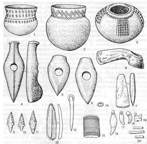 1 сосуд московско-клязминского типа; 2 сосуд верхневолжского типа; 3 сосуд средневолжского типа; 4 ладьевидный каменный топор; 56 каменные топоры; 7 клиновидный каменный топор; 8 вислообушный бронзовый топор; 9-11 каменные стрелы; 12 кремневое орудие; 13 костяная проколка; 14 медное колечко; 15 браслет; 1620 украшения.