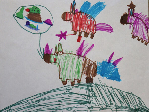Таня: «это зверек наполовину лиса, наполовину кот, наполовину лев. Называется прадабазавар». Зверь из трех половин, ну прямо я с девчонками. У Тани что ни рисунок, то прадабазавар.