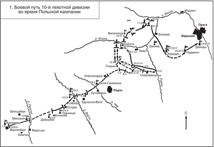 Маршрут продвижения и боевой путь 10-й пехотной дивизии во время Польской кампании изображен на схеме 1. Он делится на семь отрезков: