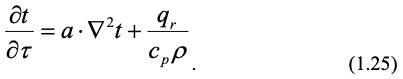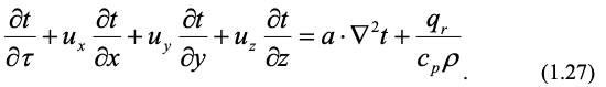 Выражение в скобках в уравнении (1.24) является оператором Лапласа, с учетом его сокращенного обозначения и дополнительного источника тепла qr, например, за счет химической реакции, с введением коэффициента температуропроводности а = / ср ρ, получим для выражения (1.24):