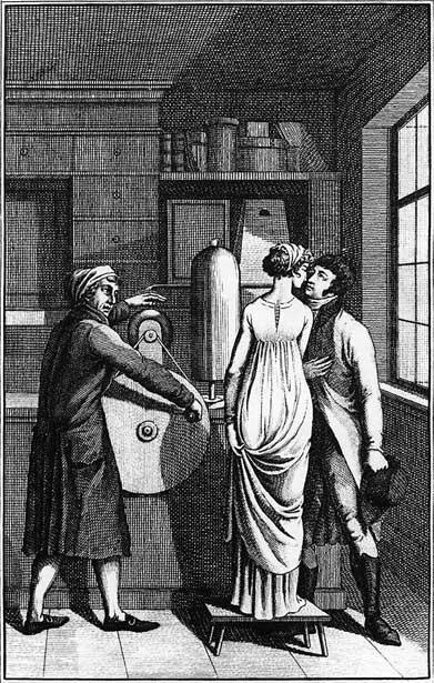 Был еще и «электрический поцелуй» это развлечение придумали даже до изобретения лейденской банки, но после него оно стало намного веселее. Физиолог Альбрехт фон Галлер из Гёттингенского университета с удивлением отмечал, что подобные салонные игры «даже сумели вытеснить кадриль». «Вы можете поверить, писал он, что изящный пальчик барышни, ее юбка из китового уса могут вызывать вспышки настоящей молнии, что очаровательные губки могут поджечь дом?»