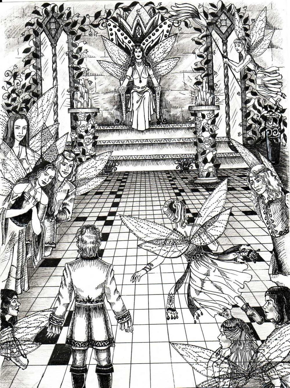Наконец они пришли в тронный зал с колоннами, выложенными перламутровыми раковинами. На высоком троне, под балдахином с золотыми кистями, сидела королева Лионесса с милым и приветливым лицом, а по обеим сторонам от нее находились толпы придворных. Мальчика поразили их прекрасные лица, лучистые глаза, сложные прически из длинных, перевитых серебряными и золотыми шнурами, волос, прозрачные одежды, переливающиеся всеми цветами радуги. Ноги придворных, обутые в золотые сандалии или башмачки с причудливо закрученными носами, не касались пола. По залу гулял легкий ветер от трепета их крыльев. При виде Ристарда все придворные низко поклонились, а королева нежно улыбнулась. Мальчик поклонился ей и, вглядевшись, почувствовал некоторое облегчение. Не смотря на то, что королеве было больше двух тысяч лет, выглядела она значительно моложе.