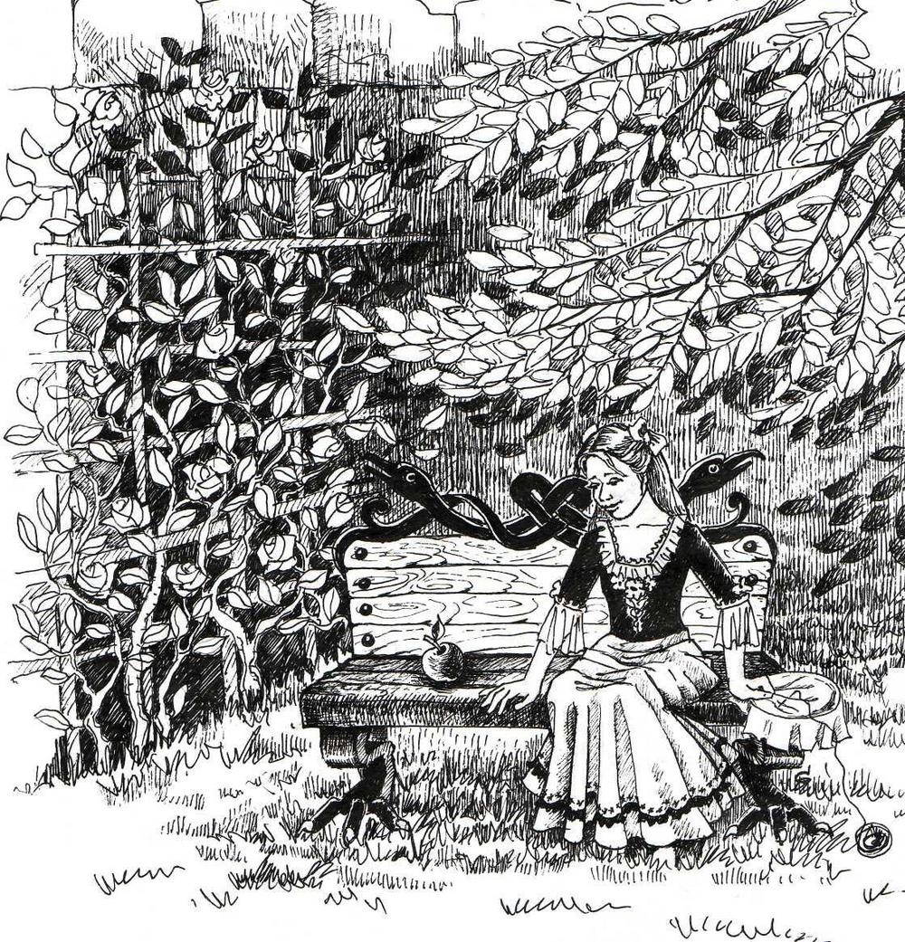 Любимым местом Мариккен была высокая каменная стена, увитая вьющимися розами, которая находилась в конце сада. Однажды, когда девочка пришла к стене, то на скамейке, где она обычно сидела, Мариккен нашла большое белое яблоко с золотистым отливом.