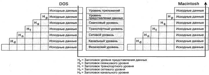 Когда сообщение спускается вниз по первому стеку, на каждом уровне этого стека (кроме канального уровня) добавляется заголовок. Заголовки содержат управляющую информацию, которая считывается и обрабатывается соответствующим уровнем стека получателя. При переходе вверх по стеку принимающего компьютера добавленные заголовки удаляются соответствующими уровнями, которые используют полученную информацию, чтобы определить, как поступить с содержимым сообщения