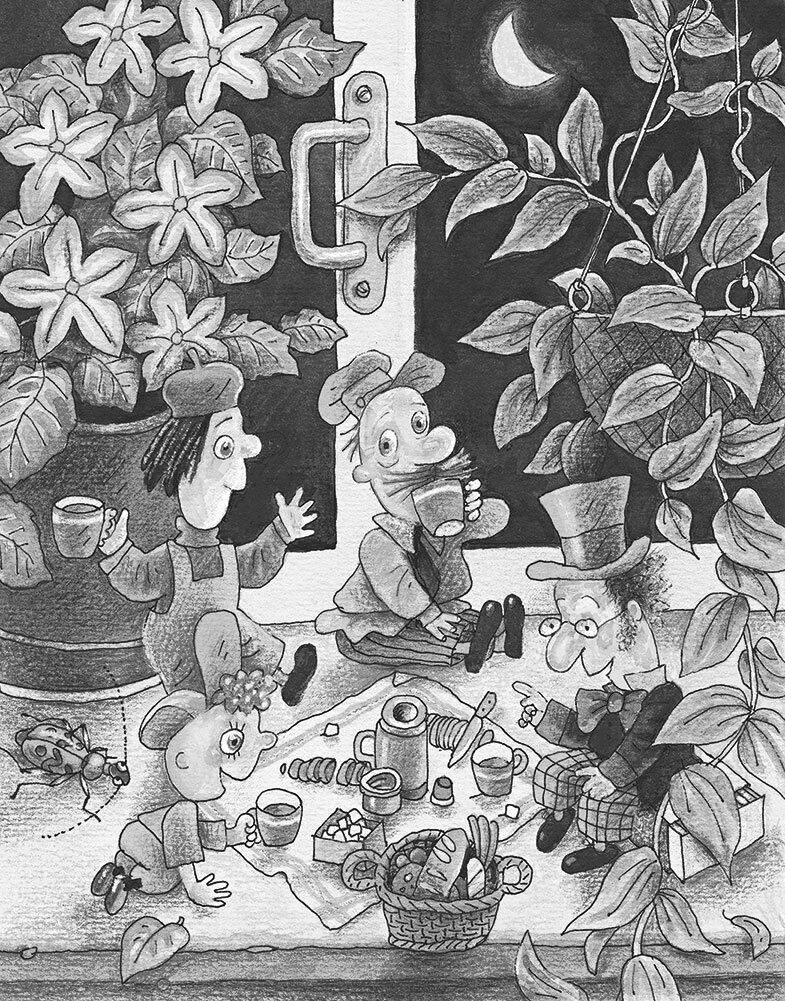 Холодилин вынес корзину с едой, и по плетям традесканции все забрались на подоконник. Новый мастер разлил чай из термоса по кружкам и сказал: