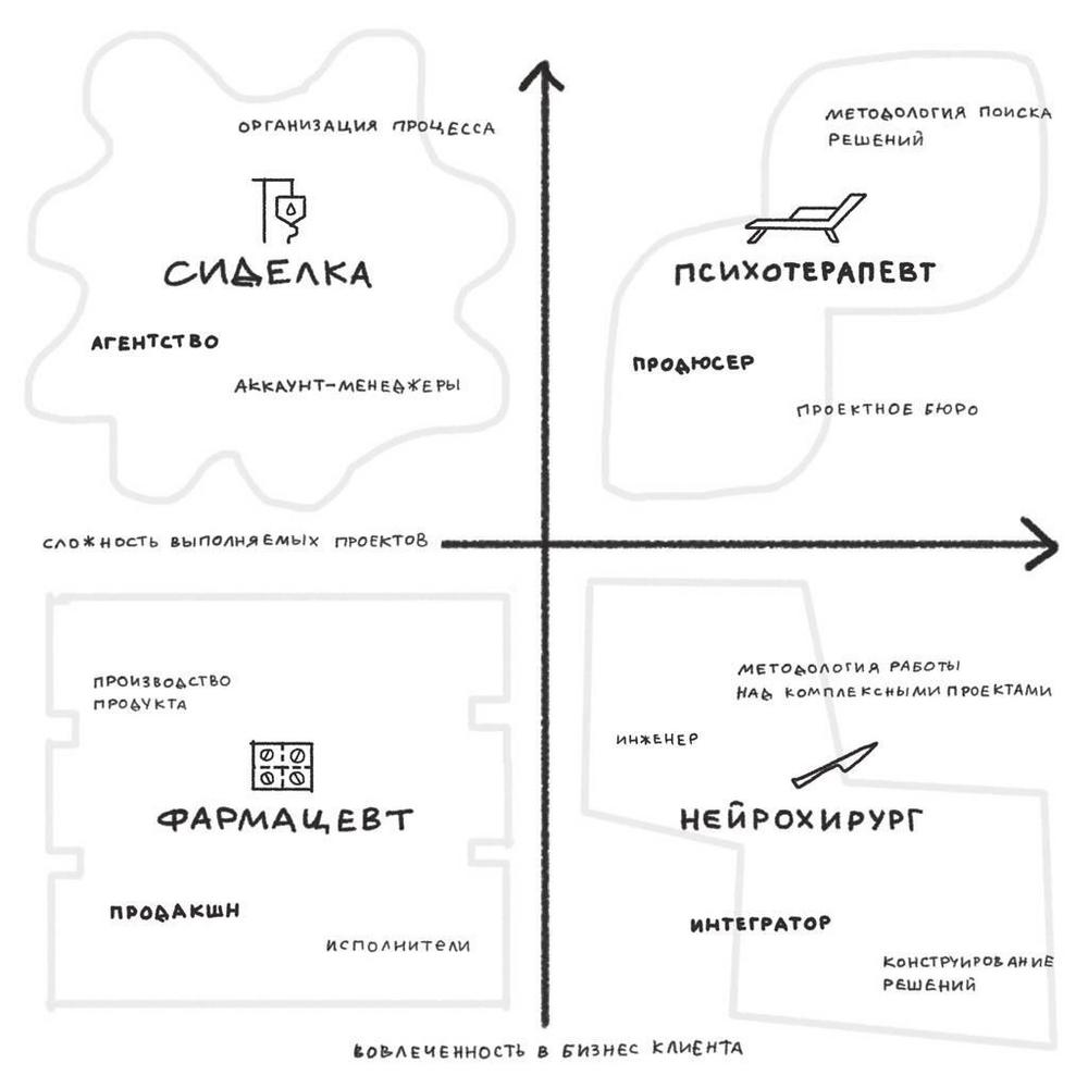 Существует ещё один способ думать о тех, кто создаёт и поддерживает цифровые продукты. Если выше я рассматривал проекты как таковые и описывал их типы, то тут речь идёт о том, в каком формате над проектами работают отдельные специалисты или команды. Критериями здесь являются степень вовлеченности подрядчика во взаимодействие с клиентом и сложность задач.