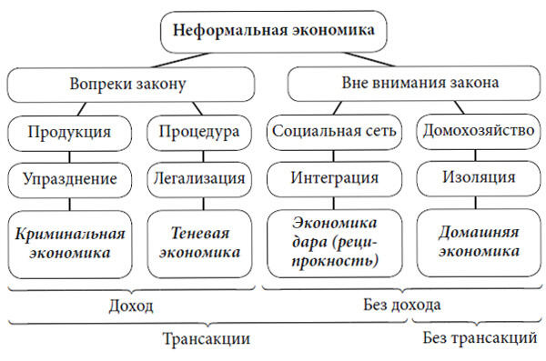 Как видим, неформальная экономика это не монолит, не материк. Скорее, это архипелаг островов. И разные ученые концентрировали свое внимание на разных островах, не замечая или сознательно игнорируя остальные.