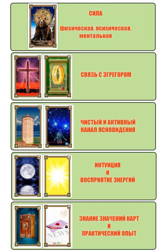 К чему я это говорю? Я хочу, чтобы мой читатель понял, что карты это только лишь инструмент для считывания информации. А основную работу выполняют сам гадающий и Высшие силы. А для того, чтобы эта взаимосвязь была сильной и плодотворной, каждому практикующему помимо теоретических и практических знаний о самих картах, необходимо развивать в себе парапсихические способности и силу. Тренируйте интуицию, укрепляйте свою энергетическую оболочку, учитесь накапливать психическую энергию, овладевайте навыками ясновидения.