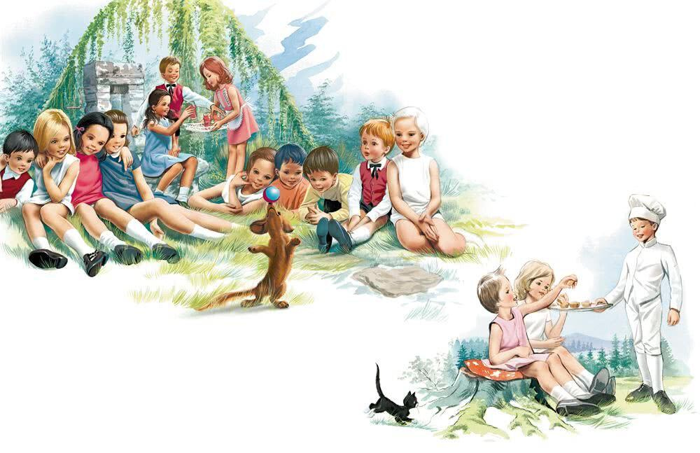 Мы с Филей незаметно сбегали на кухню. Я повязала белый фартук, Филя надел поварской колпак. Мы оба взяли по подносу и понесли гостям.