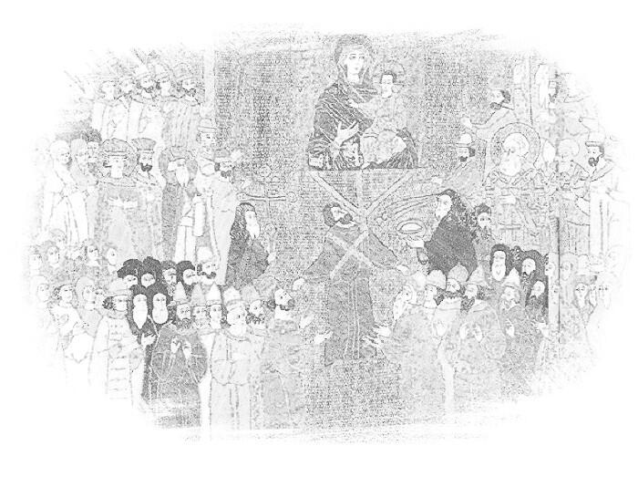 Среди многих лиц, помещённых на полотне, к сожалению, не все могут быть отождествлены с реальными людьми. Но несомненно, что две фигуры расположеннее во втором ряду с левой стороны с нимбами над головами это великий князь Иван III и его внук Дмитрий Иванович. Старец с седой бородой это Иван III, юноша в позе причастника Дмитрий Внук. На против них помещена фигура митрополита Симеона.