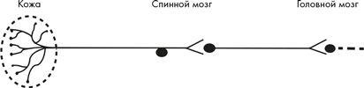 На рисунке показаны два нейрона на проводящем пути тактильной чувствительности; участок кожи, обозначенный пунктирной линией, называется рецептивным полем (соответственно сенсорная информация на схеме перемещается слева направо). Первый нейрон имеет длинный отросток (аксон), идущий от кожи где он разветвляется на множество тончайших нервных окончаний к спинному мозгу. Когда вам на руку садится комар, его ноги слегка давят на кожу над нервным окончанием. Нейрон регистрирует это давление и генерирует нервный импульс. Импульс проходит по аксону через тело клетки и доходит до синапса (на рисунке обозначен раздвоенной линией), соединенного со вторым нейроном, который находится в спинном мозге и передает сигнал дальше в головной мозг. (Существуют и другие пути передачи сигналов в мозг. Это один из самых простых.)