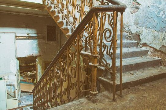 По лестнице. Мы начинаем подъём по лестнице из такого же «колбасного» камня, держась за крашенные коричневой краской резные перила, закреплённые на металлических витиеватых «балясинах».