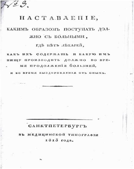 Фото 10. Титульный лист II части книги И.И. Энегольма «Наставление, каким образом поступать должно с больными, где нет лекарей, как их содержать и какую им пищу производить должно во время продолжения болезней, и во время выздоровления от оных», 1813 год