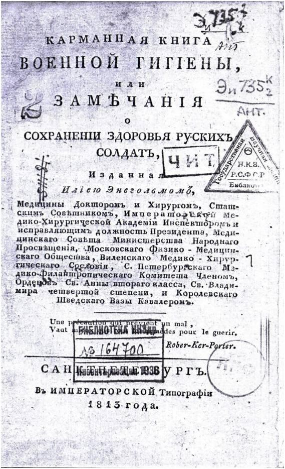 Фото 7. Титульный лист книги И.И. Энегольма «Карманная книга военной гигиены, или замечания о сохранении здоровья русских солдат», 1813 год