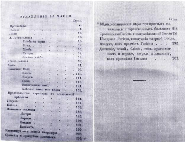 Из оглавления первой части можно сделать вывод, что автор представляет читателю структуру военной гигиены того времени.