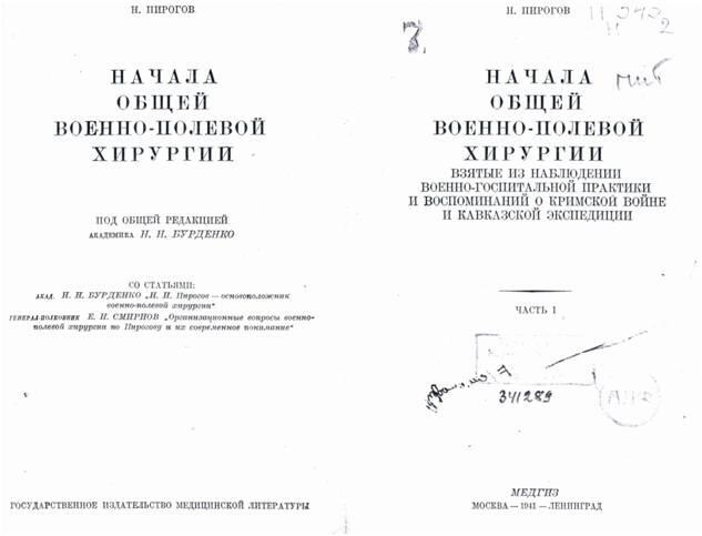 Фото 19. Титульный лист книги Н.И. Пирогова «Начала общей военно-полевой хирургии, взятые из наблюдений военно-госпитальной практики и воспоминаний о Кримской войне и Кавказской экспедиции», 1941