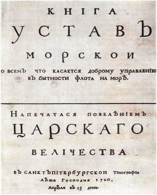 Фото 2. Титульный лист книги «Устав морской о всём, что касается доброму управлению в бытность флота на море», 1720 год