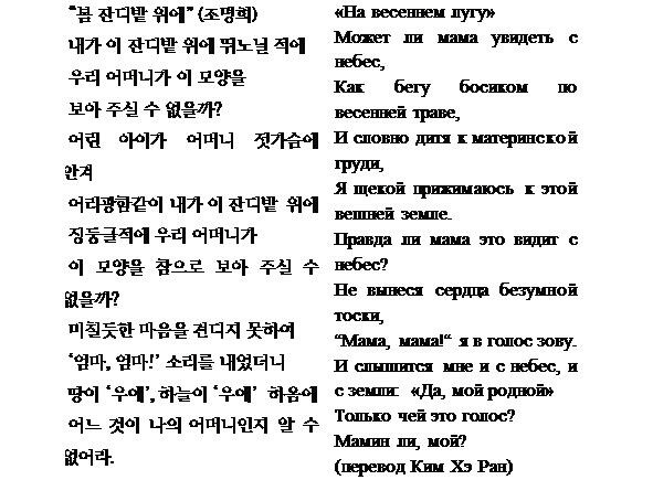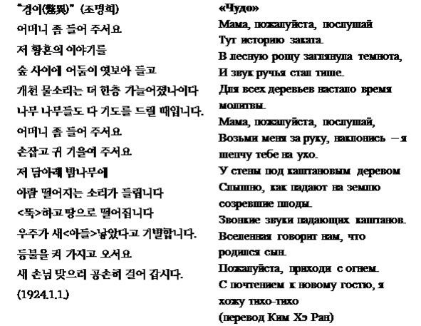 Кроме того, мы можем догадаться из содержания, что на написание произведений «На весеннем лугу» и «Чудо» сильно повлиял Тагор. На мой взгляд, если мать потеряла свою родину в стихотворении «На весеннем лугу», написанном в 1924 году, то в стихотворении «Чудо», написанном 1 января 1924 года, подразумевается, что мать это Родина, а новый гость означает освобождение Родины.
