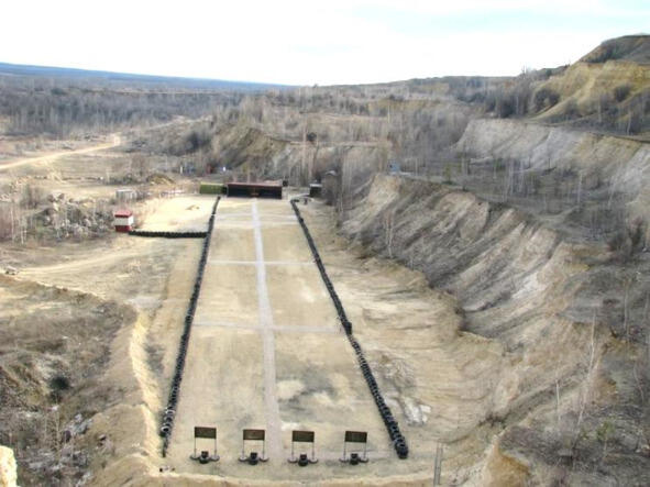 Ещё одним важным элементом учебного лагеря является стрельбище, обеспечивающее возможность стрельбы из ручного стрелкового оружия на дальности 50500 метров, с места и в движении. Идеальным можно считать размещение стрельбища у подножия горы, либо в карьере, когда за дальней линией мишеней находится гора, либо высокий земляной вал, исключающий неконтролируемый разлёт пуль (фото 12).