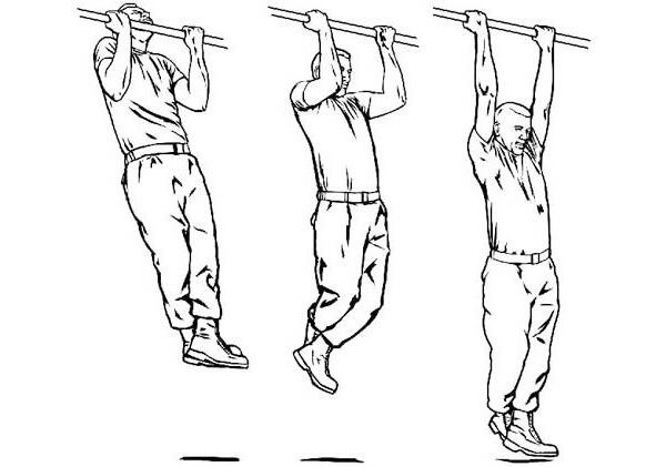 Выполняются подтягивания широким и узким, прямым и обратным хватом. Правильное выполнение упражнения: подтягивание без рывков, не сгибая ног, поднятие подбородка до перекладины, с кратковременной фиксацией; опускание вниз до полного выпрямления рук (рисунок 11, фото 13). Ширина хвата развивает разные группы мышц в разной степени, поэтому желательно чередовать способ выполнения подтягиваний (рисунок 12).