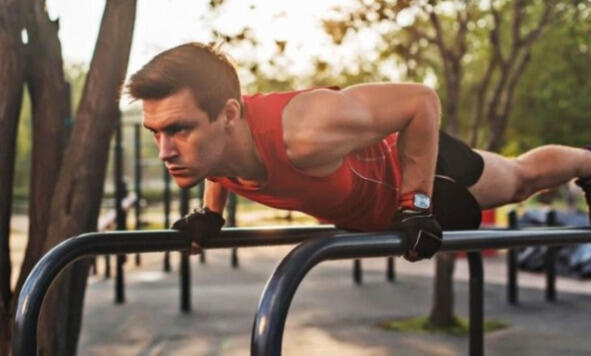 Другой спортивный снаряд, брусья, тоже достаточно универсален, и позволяет выполнять широкий набор упражнений (вертикальные и горизонтальные отжимания, отжимания в амплитуде, с махами туловищем, упражнения для брюшного пресса).