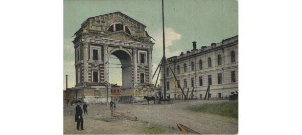 В память об этом и по случаю празднования десятилетия царствования Александра I в 1811 г. здесь заложили триумфальные ворота (ул. Нижняя набережная, 8/1). Хотя авторство этого удивительного для провинции сооружения приписывается губернскому архитектору Я. А. Кругликову, едва ли он мог сам догадаться до столь интересного решения.