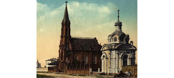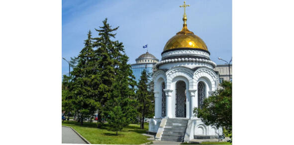 Сразу за стелой можно увидеть небольшую часовню, построенную по инициативе администрации 4 октября 2000 г. на месте алтаря уничтоженного в 1932 г. Казанского кафедрального собора (ул. Ленина, 1Б). Она является уменьшенной копией одного из куполов храма. В основание постройки заложены камни из фундамента утраченной церкви.