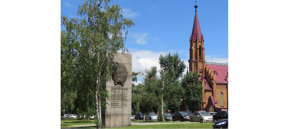 В конце улицы нас вновь встречает Польский костел, а мы поворачиваем налево и двигаемся в сторону главной городской площади. Справа мы видим небольшую стелу из розового гранита, которая была установлена в память о награждении Иркутской области Орденом Ленина 8 июня 1967 г. за успехи, достигнутые трудящимися области в хозяйственном и культурном строительстве, создании крупных промышленных и энергетических комплексов на реке Ангаре.