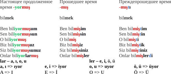 Субъектsивные времена на mış (сам не вижу / не видел, рассказывают / рассказывали yormuş (настоящее), -mış (прошедшее), -mıştı (преждепрошедшее)