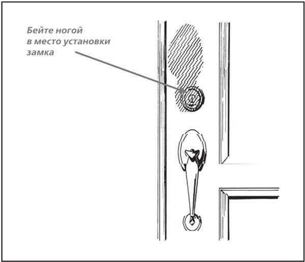 Удары ногой более эффективны, чем толчки в дверь телом с разбега ваша нога бьет сильнее, чем плечо, и вы можете более точно направить удар в область замка.