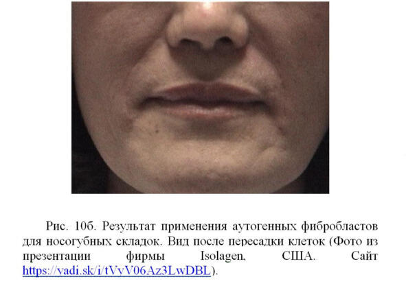 В первые часы после введения клеток наблюдаются местные эффекты в виде гиперемии (местное увеличение притока крови) и небольшого отека, которые исчезают через 23 ч. после процедуры. Положительный эффект начинает проявляться через 68 ч. после процедуры, что выражается в увеличении тургора (упругости) и эластичности кожи, ее кровоснабжения. Отмечен положительный эффект, заключающийся в исчезновении мелких и уменьшении крупных морщин (Крихели и др., 2004). Улучшение кожи происходит в течение нескольких месяцев. Сохранение положительного эффекта прослеживается на протяжении 12 мес. Пример применения аутогенных фибробластов для лечения носогубных складок показан на рис. 10а и 10б. На рис. 11а и 11б приведен пример улучшения поверхности кожи около глаз: рис. 11а область глаза до процедур, рис 11б через несколько месяцев после применения терапии. Видно, что количество и глубина морщин после процедур заметно уменьшилось. На рис. 12а и 12б показан результат лечения лобных морщин.