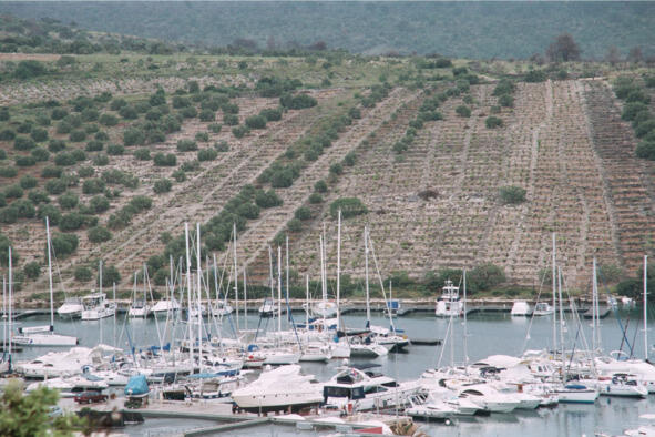Пикап практически уже вырулил и начал набирать скорость, но я так энергично замахал рукой, что тот остановился. В машине было двое мужчин. На мой вопрос относительно Примоштена мне ответили «можно» и пригласили садиться, что я тут же и сделал. Разговорившись, оказалось, что Марио (шофер) видел, как я голосовал, когда он проезжал мимо отеля, но не остановился только потому, что ехал за своим другом сюда, в Марину, а еще он сказал, что многие ездят автостопом и это нормально. Я им рассказал, где уже побывал в Хорватии и куда собираюсь съездить. На подъезде к Примоштену я смог воочию увидеть знаменитые виноградники, растущие в выдолбленной в скале и очищенной от камня почве. Фотографию этого места можно увидеть в здании ООН в Нью-Йорке, как символ трудолюбия человека.