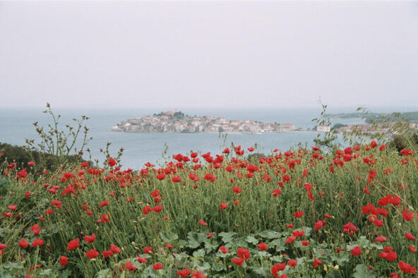 Моему взору предстала небольшая полянка с огромными красными маками в окружении сочных лопухов. Город-остров лежал как на ладони. Дождь прекратился. Выглянуло солнце. А поскольку все так удачно складывалось, то следовало продолжить свои изыскания и попытаться дойти до «ооновских» виноградников.