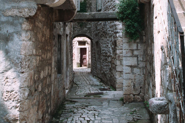 Утолив информационный голод, следовало заняться изучением города, что я и сделал. Перейдя маленький мост, соединяющий континентальную часть Трогира с его исторической островной частью, я миновал Северные ворота и ступил на мощеные улочки «stari grad». Нужно отметить, что практически во всех городах Хорватии так, как правило, называется старый город или та часть города, в которой расположены наиболее интересные замки, дворцы, крепости, монастыри и храмы. Поэтому, ища исторический район какого-либо населенного пункта, нужно просто спрашивать направление к «стари граду». Кому этого покажется мало, пусть обращается к справочникам и путеводителям, там иногда даже схемы приводят.