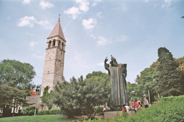 От крепости парк отделяли полутораметровый облицованный гранитом парапет, напоминающий акведук, в верхней части которого в направлении стен города струился ручей, и небольшой ров-желоб для сбора излишков стекающей воды. Парапет заканчивался невысоким прямоугольным проемом, с потолочной части которого сбегали тонюсенькие ручейки, имитируя дождевую завесу. Обогнув искусственный ручей-водопад, я вышел к бронзовому монументу славянскому религиозному проповеднику Х века Нинскому, боровшемуся за права сограждан и объединение Хорватии. По местному поверью, человеку, который потрогает большой палец левой ноги Нинского, будет сопутствовать удача, поэтому желающих прикоснуться к этой части памятника было великое множество, о чем красноречиво свидетельствовал ее зеркальный блеск на общем фоне, позеленевшем от времени. Для справки, аналогичная скульптура, но меньших размеров, находится в городе Вараждин, недалеко от Загреба.