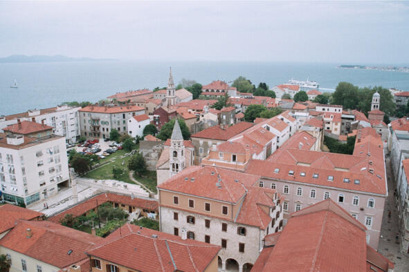 Пройдясь по площади возле церкви и выбирая наиболее удачные ракурсы для съемки, я постепенно сместился к стенам Францисканского монастыря, откуда спустился к набережной, а затем возвратился обратно в центр. Прохаживаясь по узким улочкам города, обнаружил несколько зданий с красивыми узорчатыми барельефами, изображающими львов, рыцарские доспехи и всевозможные переплетения цветов, букв и цифр. Понравилась мне и церквушка, украшенная скульптурными изваяниями ангелов, расположенная в конце Широкой (Široka) улицы. А очутившись перед собором Св. Анастасии XII века, долго не думая, зашел внутрь и посидел в тиши на скамеечке, любуясь внутренним убранством базилики, а затем, поднявшись на колокольню собора, смог по достоинству оценить красоту города.
