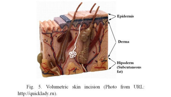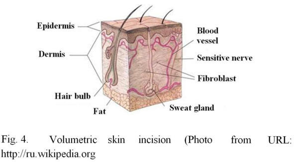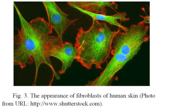 Fibroblasts are the main cells of the middle connective tissue layer of the skin, called derma (Fig. 4, 5). The principal function of fibroblasts in dermal skin layer is participation in metabolism of cellular substance. Fibroblasts of the skin synthesize and secrete into the environment a large number of biologically active substances, among which there are various growth factors, extracellular matrix components and enzymes. This process takes place continuously, and due to it intercellular substance is constantly replaced. Particularly intense is metabolism of hyaluronic acid (Kricheli et al., 2004). As in all other organs and tissues of the human body, there are age-related changes in the skin during the whole life.