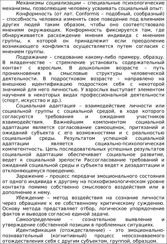 Социализация личности представляет собой процесс; формирования личности в определенных социальных условиях, процесс усвоения человеком социального опыта, в ходе которого человек преобразует социальный опыт в собственные ценности и ориентации, избирательно вводит в свою систему поведения те нормы и шаблоны поведения, которые приняты в обществе или группе. Нормы поведения, нормы морали, убеждения человека определяются теми нормами, которые приняты в данном обществе.