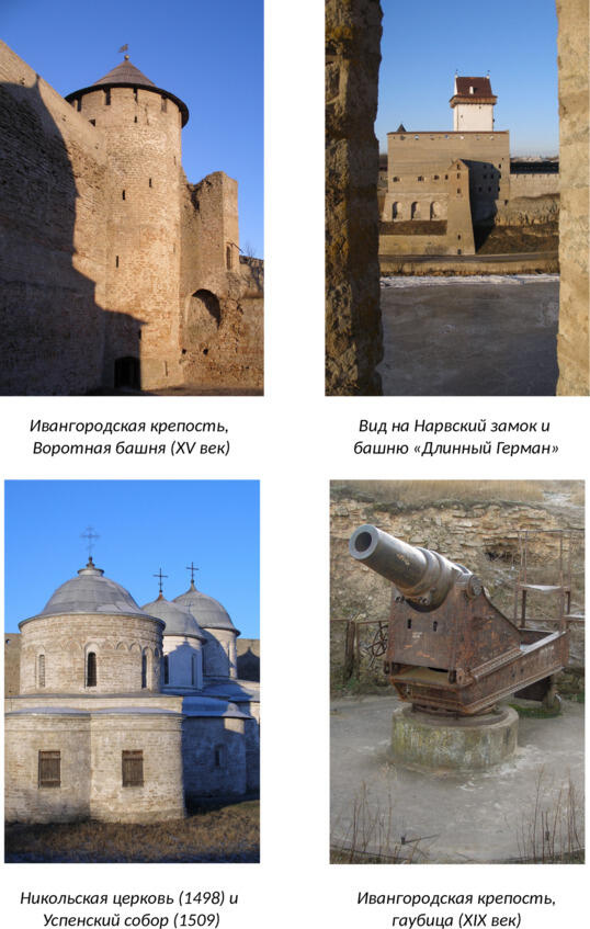 На территории так называемого Бояршего города два каменных храма: Никольская церковь (1498) и Успенский собор (1509). Авторство приписывают итальянскому архитектору Греку Маркусу. Рядом с Водяной башней, где арсенал, установлена «казематная пушка на вертящемся лафете. Очень, короче, круто». Замковая часть в том месте, где в 1492 году стояла крепость, до наших дней дошла в весьма плачевном, точнее, руинном состоянии. Однако доподлинно известно, что была она невелика и квадратная в плане. Небольшие размеры крепости породили даже легенду о том, что при ее разбивке будто бы взяли одну лошадиную шкуру, разрезали на узкие полосы, а потом, связав их в ленту, определили размеры крепости. Поэтому-то местные жители называли Ивангород «городом лошадиной шкуры». Стены Переднего города возведены в начале XVI века, дабы исключить длительность осады крепости с суши. «С крайних к реке стен крепости можно практически докинуть камнем до аналогичной крепости эстонской. Камней мы, конечно, пожалели, но постарались всё тщательно зафоткать. Одна беда дубак, как всегда, был страшный и аккумулятор банально замерзал. Ну, чем богаты, тем и рады. Вот только склеить бы отснятые панорамы».