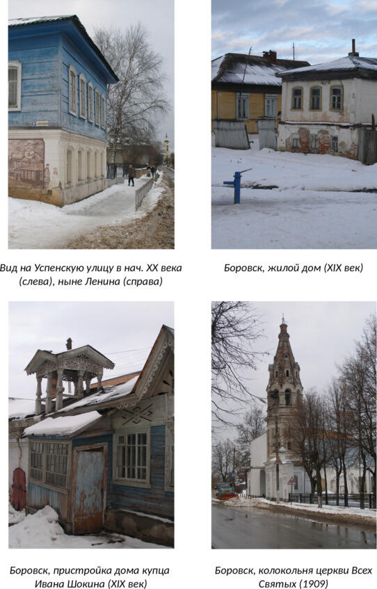 Боровск знаменит не только овчинниковскими фресками. Радуют взор прохожих изысканные рисунки резных наличников и цветочный орнамент карнизов деревянных домов. Улочки, застроенные двухэтажными толстобокими домиками с каменным низом и деревянным верхом. А уж о церквях и говорить не приходится. Храмы на каждом шагу. Все излазить и изучить времени не хватит. Вот впереди в «лесах» «тело». Без окон, без дверей. Ни маковки, ни крылечка. Огромный остов, словно крепость непреступная. Воздвиженский храм (1814), некогда «принадлежавший» местному заводу и только недавно возвращенный в лоно церкви. А вот другая улочка, Успенская, ведет к центру. Дома сплошь старые. Избушки на курьих ножках. Купеческая слобода. А там что?! Башенка или угловой бастион ограды? В сумерках не разглядеть. Некогда была тут старообрядческая община при церкви Всех Святых. В 1929 году здание передали под Дом культуры, позже разобрали, а вот колоколенка (1909) осталась. Говорят, на ее разборку денег не хватило. А еще б лучше мозгов, чтоб впредь неповадно было