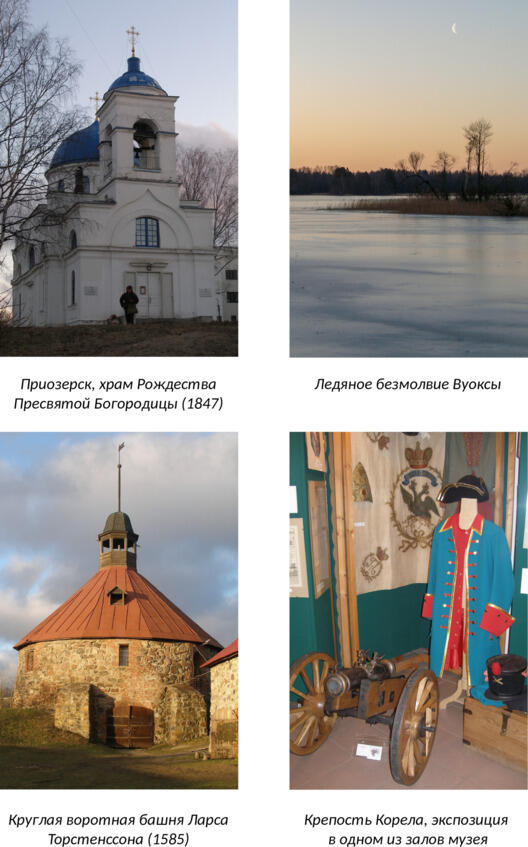Некогда это был город-крепость, ставший в XIV веке мощным форпостом Новгорода на Карельском перешейке. Здесь проходил запасной маршрут великого водного торгового пути «из варяг в греки»14, а через Вуоксу можно было попасть в Финский залив и в центральную Финляндию. Неслучайно Швеция стремилась установить контроль над этим стратегически важным маршрутом. В 15811595 и 16111710 годах Корела под шведами, да и название другое Кексгольм (кукушкин остров), соответственно, и крепость Кексгольмская. В сентябре 1710 года город взят войсками Петра I и возвращен России. Но вскоре мощь наступательного оружия возрастает и значение форпоста утрачивает смысл. Ей находят новое применение, превращая в тюрьму для политических ссыльных. В 191840 годах Кексгольм в составе Финляндии, с этого момента именуется Кякисалми (кукушкин пролив). В обиходе и шведское название. Лишь после Великой Отечественной город войдет в состав Ленинградской области, а с 1948 года станет называться Приозерск.