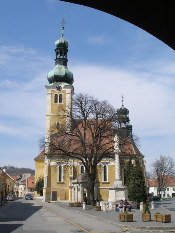 Комплекс средневековых барочных храмов на площади Jurisics tér: изящный в бело-желтых тонах Святого Эмерика (Szent Imre) и скромный с выцветшим фасадом Святого Якоба (Szent Jakab). Осматриваю их с повышенным интересом.