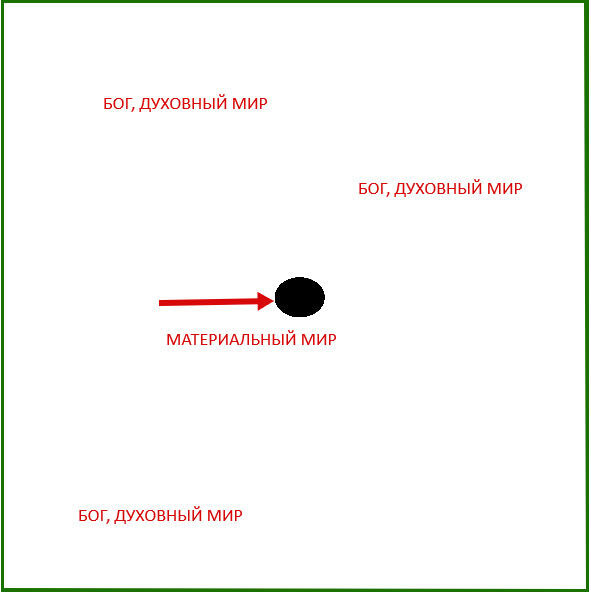 Чёрная точка это символическое изображение материального мира. Это и деревья, и реки, и наше тело, и планеты, и звёзды и т. д. А Бог везде там, где белый фон. Он в духовном мире, в раю. Бог в позаматериальной субстанции. Для того чтобы это понять и уяснить, недостаточно просто взглянуть на рисунок и прочитать эти строки. Найдите время, когда вас никто не побеспокоит, и взгляните на природу. Взгляните на то, что вас окружает, и постарайтесь проникновенным и проницательным внутренним взглядом прочувствовать духовный мир, в котором Бог. Мир духовный, который существует одновременно с материальным. Мир духовный, который есть исток для материальных изменений. Например, качнулась ветка дерева. Подумайте: почему она качнулась? От ветра. А почему подул ветер? Учёные найдут объяснение и этому. Но какое бы объяснение ни нашли учёные, если копать в этом направлении глубже, вы поймёте, что есть Исток, Первопричина, которой нет научных объяснений. И именно эту причину называют Богом.