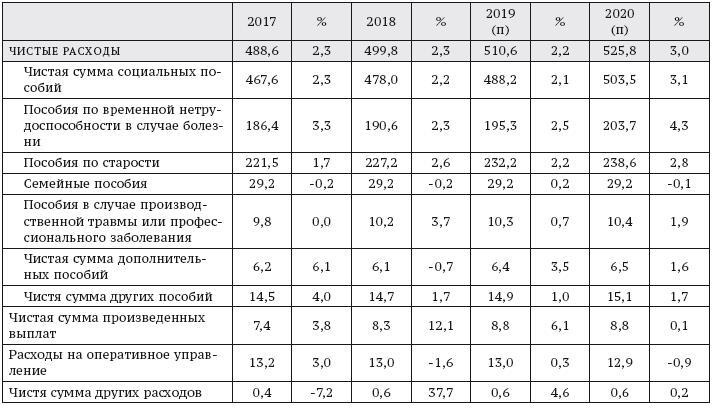 Таблица 2. Расходы и поступления по всем базовым режимам и Фонду солидарного страхования по старости (Fonds de solidarité vieillesse, FSV)* за период с 2017 по 2020 г. (млрд евро, % к предыдущему году)